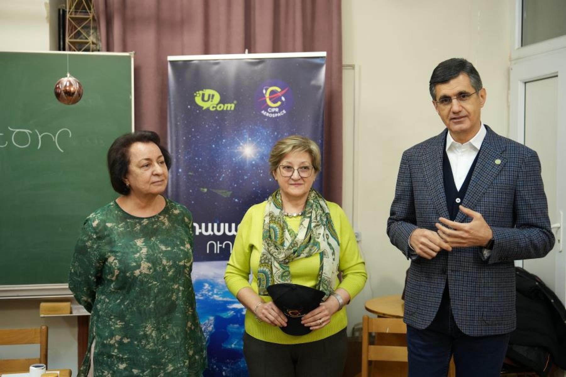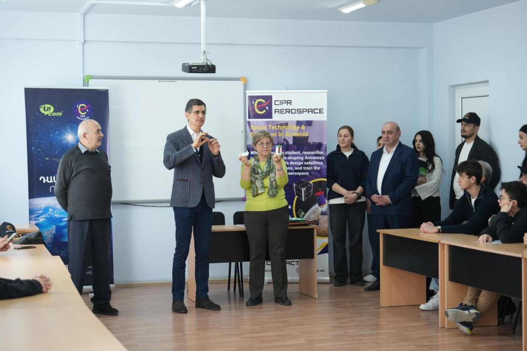 Ucom’s General Director Ralph Yirikian and CIPR Aerospace founder and CEO Mari Hrachuhi Boghosyan handed over the Space 1.0 educational kits — complete with a small artificial satellite, а ground station, a parachute system, and a user manual — to the A.H. Yeritsyan Gymnasium at Lomonosov Moscow State University Branch, as well as to the “Aregnazan” Educational Complex. Prior to this, the schools’ teachers underwent training by CIPR Aerospace specialists on the topics covered in the educational kit and they can now conduct classes using real satellite models.